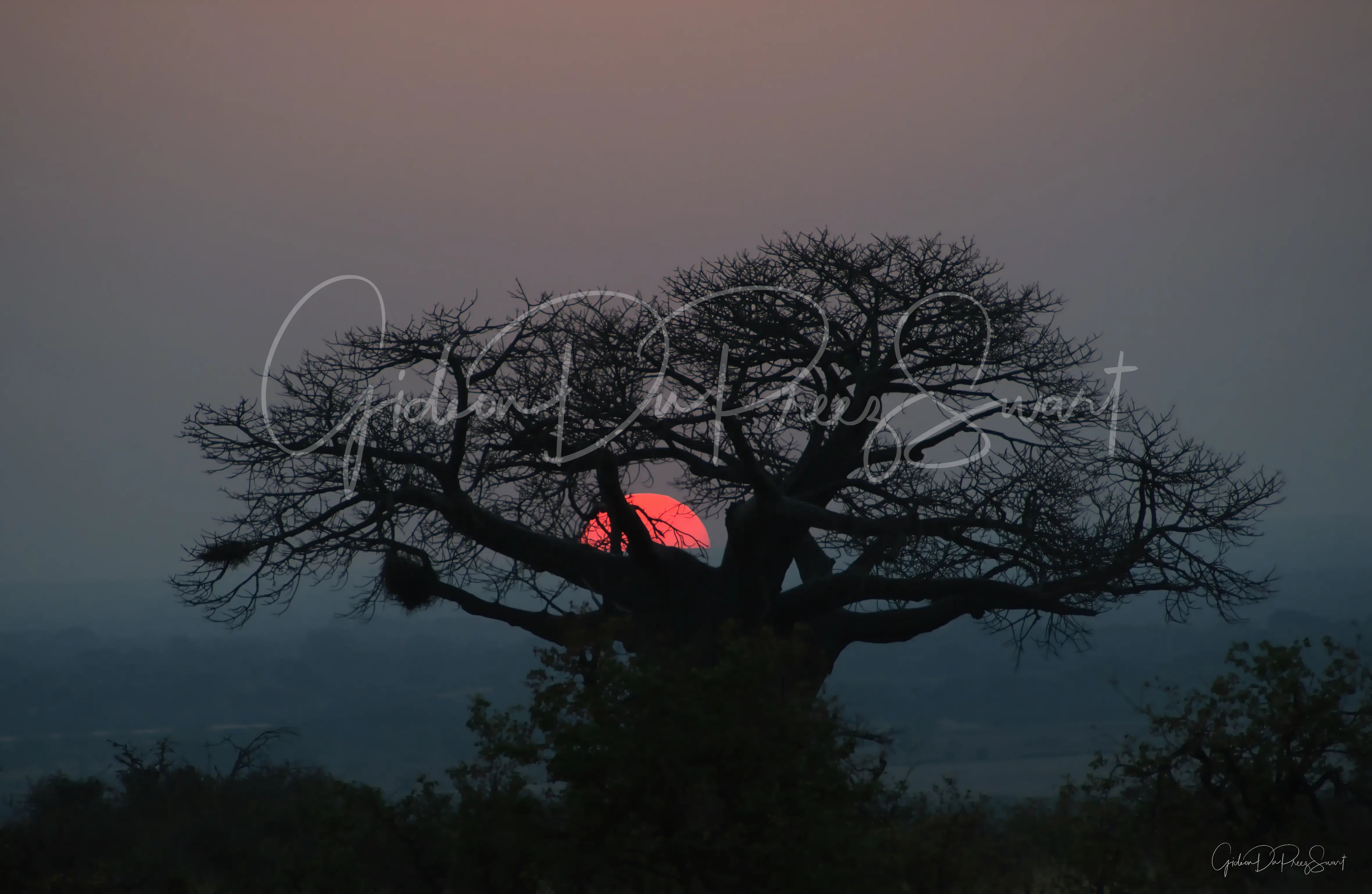 Sunset behind a Baobab on Kubu Island. Botswana.